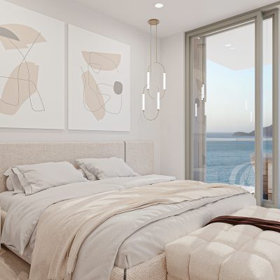 Aparta-estudio turístico de lujo en primera línea de playa con vista lateral hacia el mar desde el amplio balcón alcoba principal. Ubicado en una de las mejores playas de Santa Marta; Bello horizonte en el sector hotelero más importante de la región.